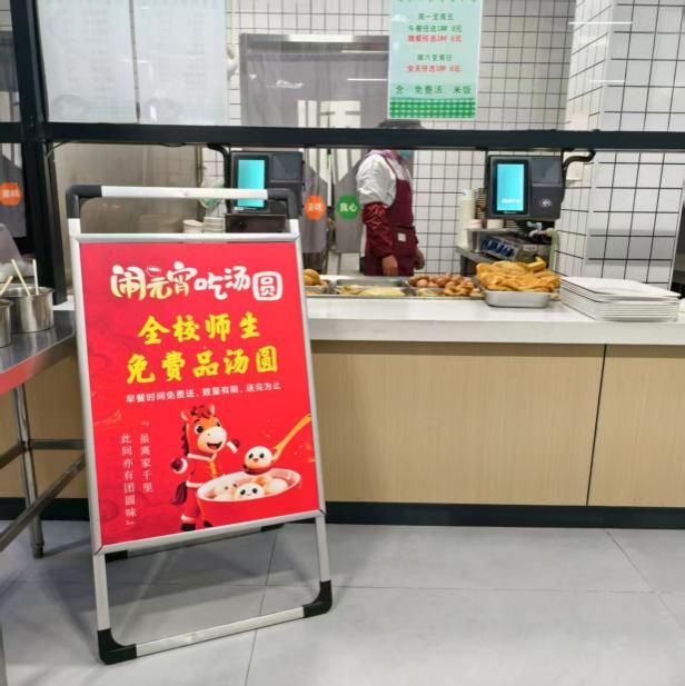 早上就餐时分,各食堂自营窗口前摆出了“元宵免费品汤圆”的醒目标识。七点时分,师生们陆续走进食堂,映入眼帘的不仅是整洁明亮的就餐环境,还有那一碗碗冒着热气的汤圆。